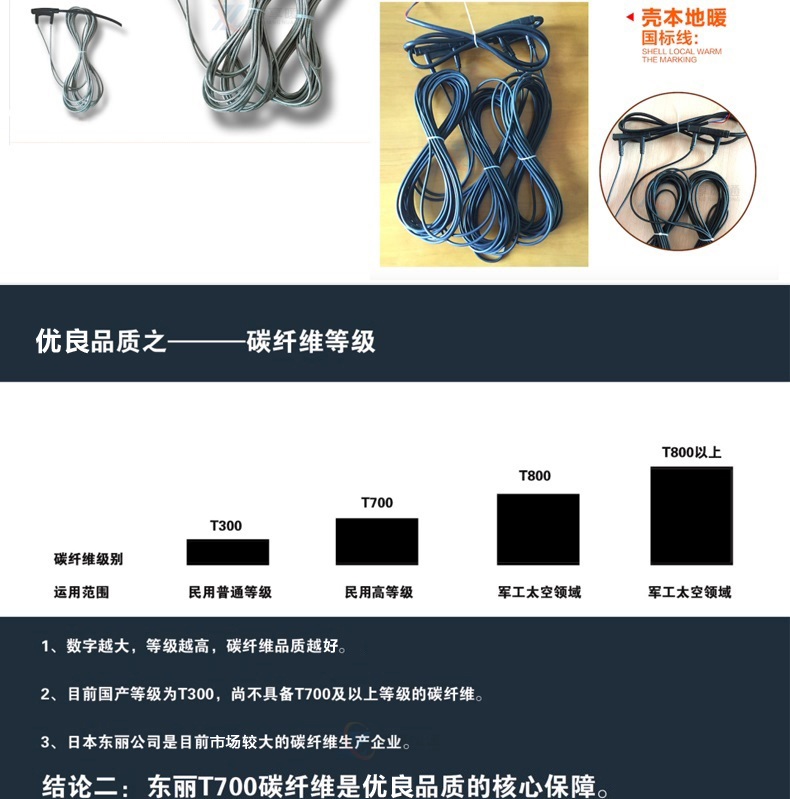 壳本长丝碳纤维发热电缆设置三层外护套保护,全部使用环保等级材料,线径厚度配置≥5.3mm,采用欧美电缆生产技术标准,使用真空铸模T型头技术,让碳纤维地暖实现温控设备下方零接头,整线密封。